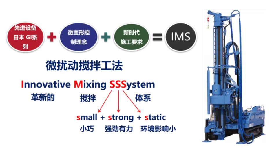 IMS工法(Innovative Mixing System)的中文名叫微扰动搅拌工法,这种工法以日本YBM公司研发生产的GI系列设备为施工主体,结合现代化的施工工艺和要求,响应施工过程中的微变形控制理念,代表的是一种革新的搅拌体系,具有功率大、重量轻、施工空间小、施工效率高、施工质量高、对土体扰动小等显著优点。